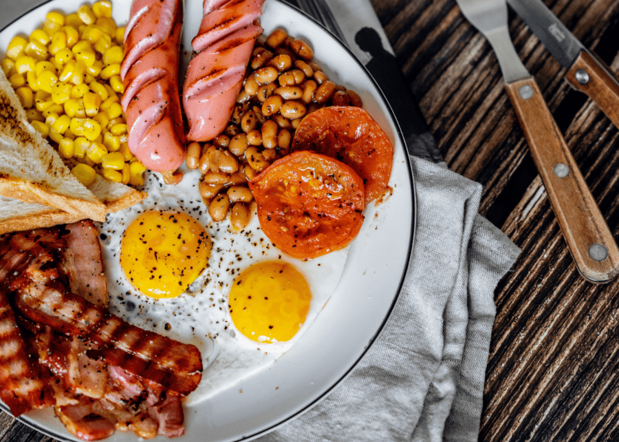 This is an example of a complete english breakfast. What we have on the menu is, some sausages, eggs, corn, red beans and toast along with a hot cup of tea.